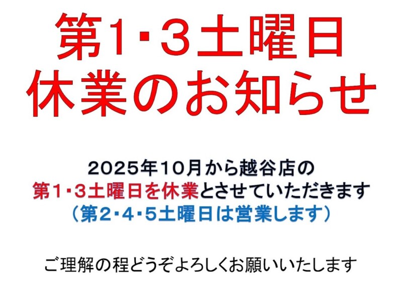 2025年10月から越谷店の第1,3土曜日はお休みになります。