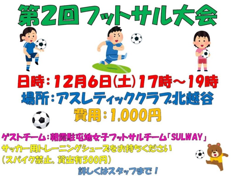 12月6日(土)17時から19時、アスレティッククラブ北越谷にて「第2回アーミーフットサル大会」を開催します!