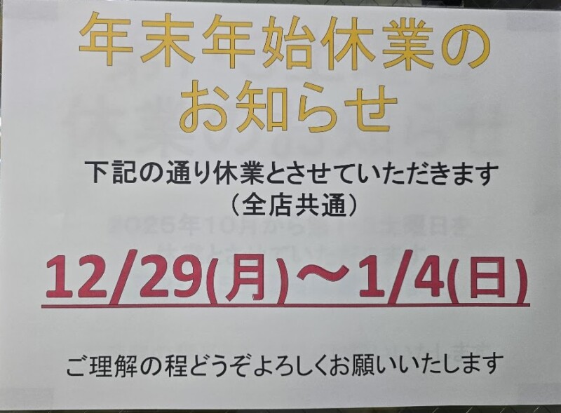 全店共通で12月29日(月)~1月4日(日)まで年末年始休業とさせていただきます。