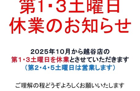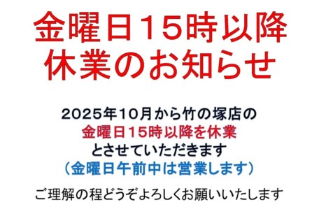 10月から金曜日15時以降お休みになります(竹ノ塚店)